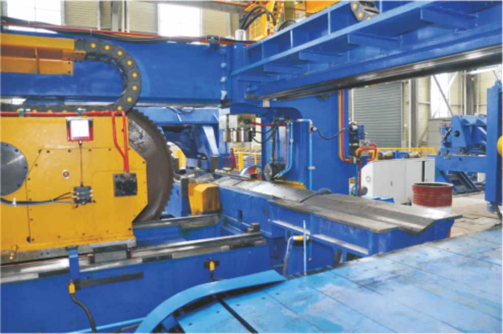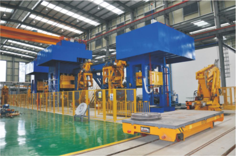 即钢坯除鳞后经5000t油压机预成型,10000t油压机成型,立式轧机轧制,5000t油压机压弯、冲孔、整形。最后经热压印,激光热尺寸测量。